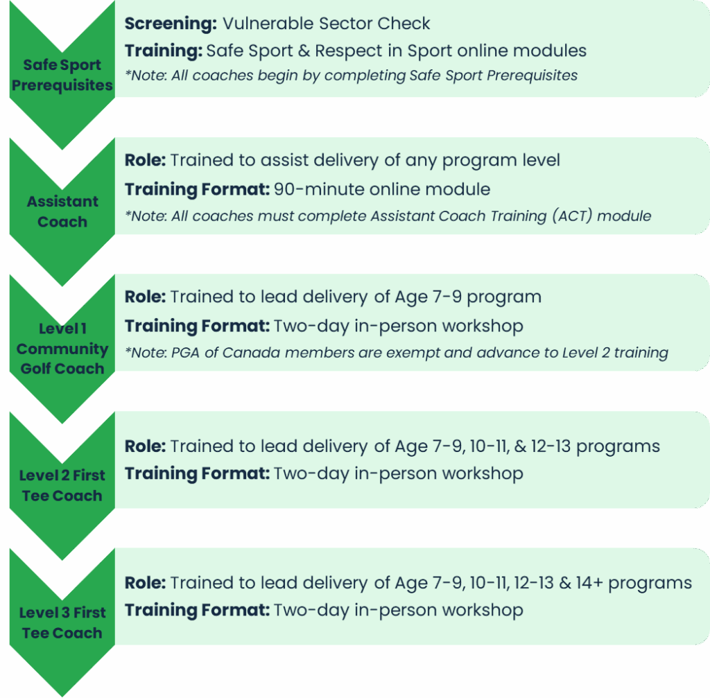 First Tee Coach Education is delivered to aspiring Coaches in Canada jointly by First Tee and PGA of Canada. This collaborative partnership enables Coaches working through First Tee Coach Education Pathway to choose their own level of involvement.